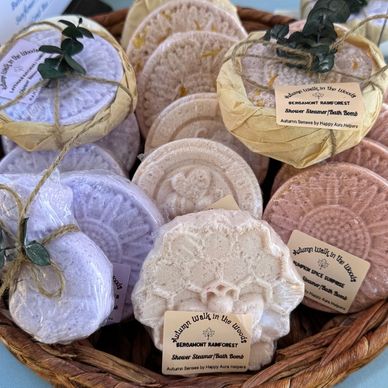 Add the vibe you need during your bath or shower to help your aura smile! our bath bombs and shower steamers are all natural and hand crafted, made with pure ingredients and chemical free to help you feel safe and clean while enjoying an array of essential oils and/or non-toxic fragrances to add a little aromatherapy to your senses. Ask more for special order requests. We make for children as well.